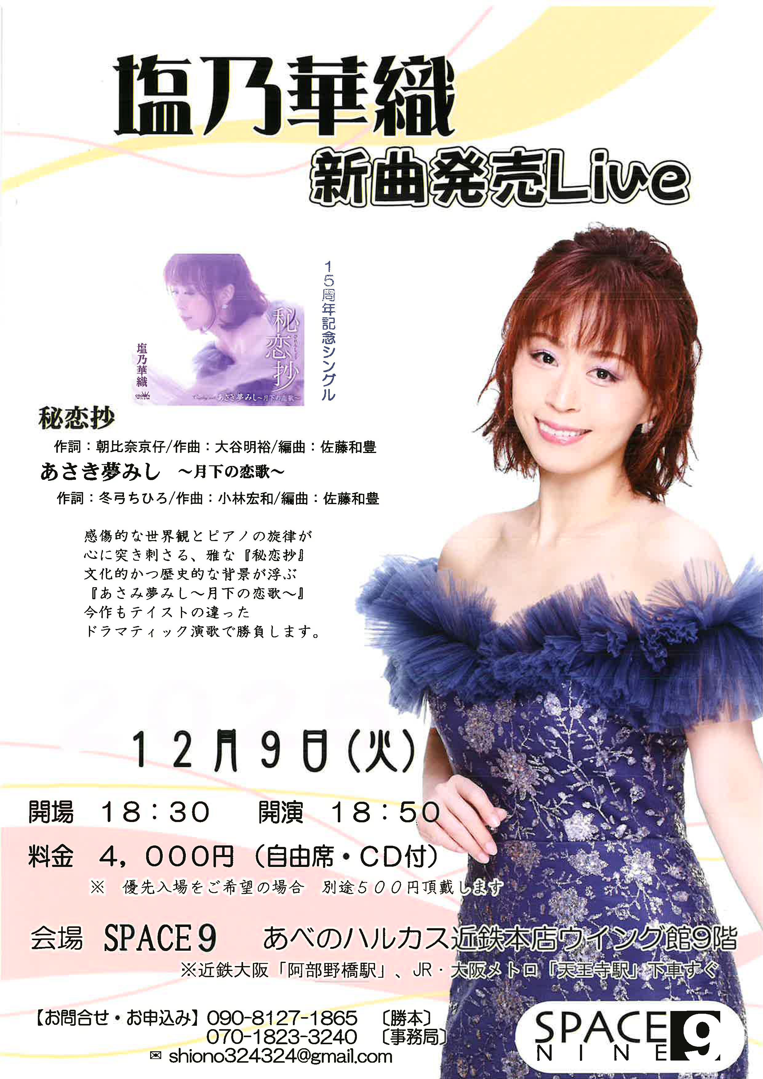 ドラマティック演歌で確固たる地位を築いている塩乃華織、 演歌からバラードまでさまざまな表情をお届けするライブ